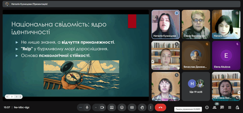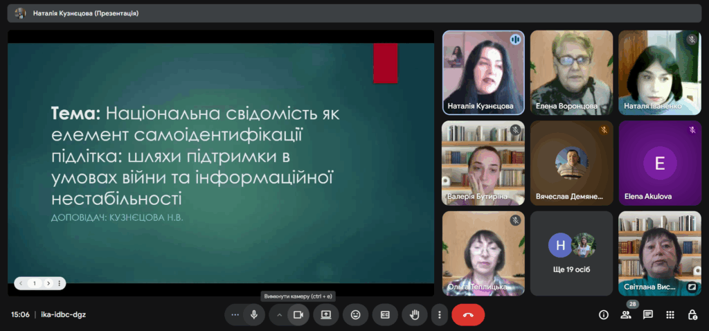 Кузнєцова Н.В. у своєму виступі на тему «Національна свідомість як елемент самоідентифікації підлітків: шляхи підтримки в умовах війни та інформаційної нестабільності» наголосила, що національна свідомість — це не лише знання історії чи мови, а й ядро самоідентифікації, цементуючий елемент особистості, який формує відчуття приналежності, стійкості та відповідальності. Завдання кураторів — створювати середовище, у якому національна свідомість формується природно й усвідомлено. Спікерка виокремила ключові напрями роботи, поділилася досвідом формування у студентів критичного мислення, патріотизму та активної громадянської позиції. Особливу увагу вона приділила питанням емоційної підтримки здобувачів освіти та розвитку мовної свідомості як свідомого вибору і засобу самовираження.