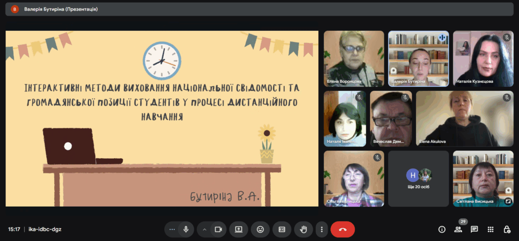 Бутиріна В.А. у доповіді «Інтерактивні методи виховання національної свідомості та громадянської позиції студентів у процесі дистанційного навчання» розкрила сутність поняття «інтерактивність», презентувала можливості використання освітніх сайтів та онлайн-платформ під час занять і виховних заходів.