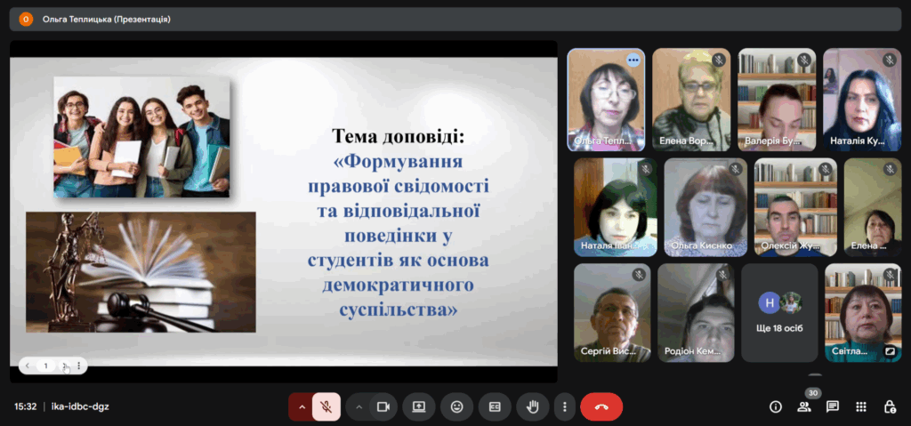 Теплицька О.Ю. акцентувала увагу на актуальності формування правової свідомості студентів в умовах демократичних трансформацій українського суспільства. Вона підкреслила необхідність системного правового виховання як передумови становлення відповідальної, свідомої та законослухняної особистості. Було визначено роль куратора як провідника правових і моральних цінностей у колективі, а також розглянуто ефективні форми роботи: інтерактивні правовиховні заходи, правопросвітницькі ініціативи, профілактику девіантної поведінки.