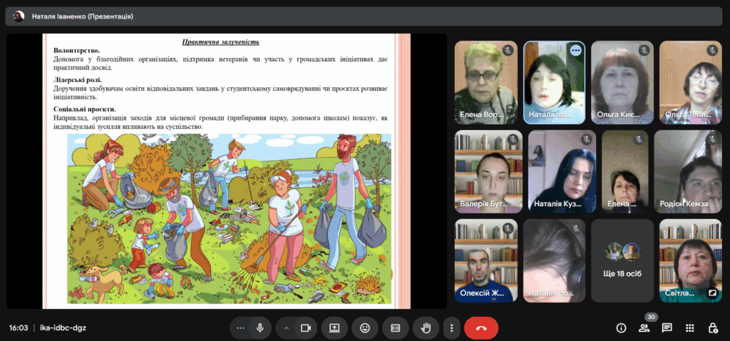 Іваненко Н.О. представила досвід з теми «Індивідуальні виховні стратегії: як допомогти студентам усвідомити особисту відповідальність перед суспільством». Спікерка окреслила значення особистої відповідальності у формуванні свідомого громадянина, розглянула психологічні основи її розвитку, роль куратора в організації виховного процесу та методи індивідуального підходу. Було презентовано практичні вправи й проєкти для розвитку відповідальності у студентських колективах, а також визначено основні виклики й шляхи їх подолання.