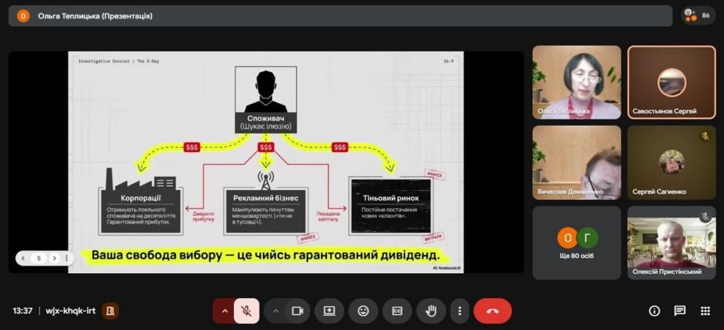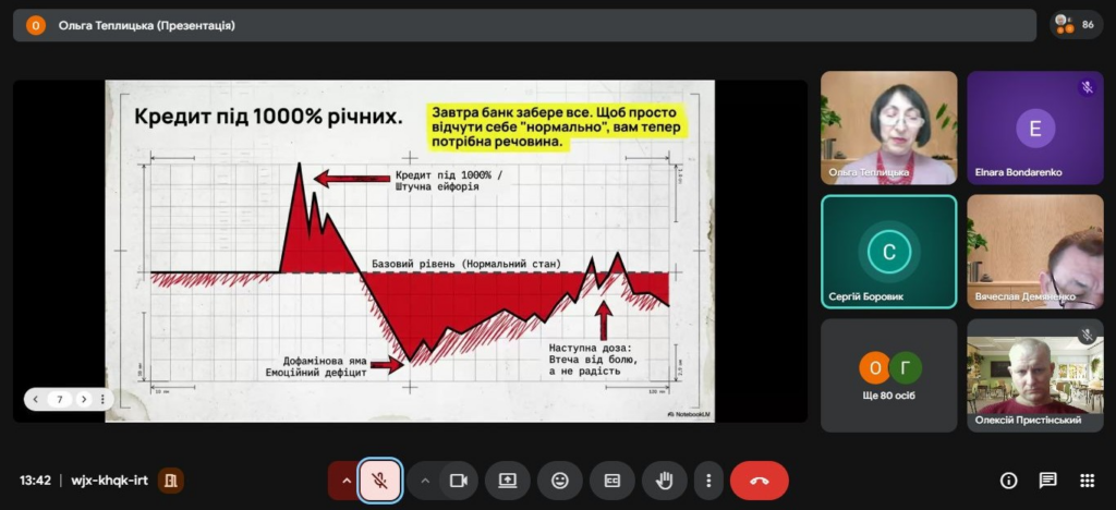 Під час обговорення учасники також торкнулися теми ілюзії контролю, коли людина переконана, що може зупинитися в будь-який момент, але насправді поступово втрачає здатність керувати своїми діями. Жваву дискусію викликали питання про межу між «спробою» та залежністю, а також про роль заперечення як одного з головних симптомів проблеми.
