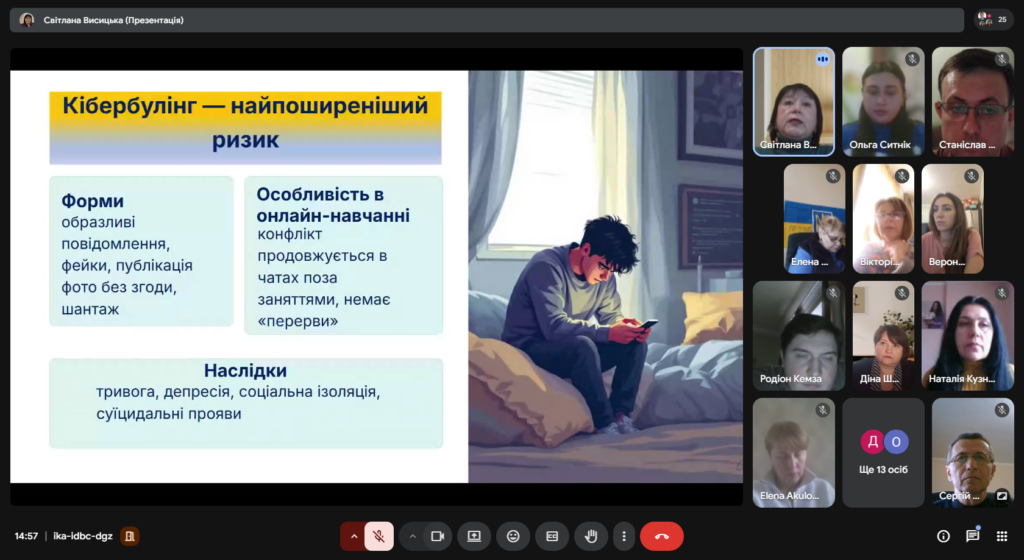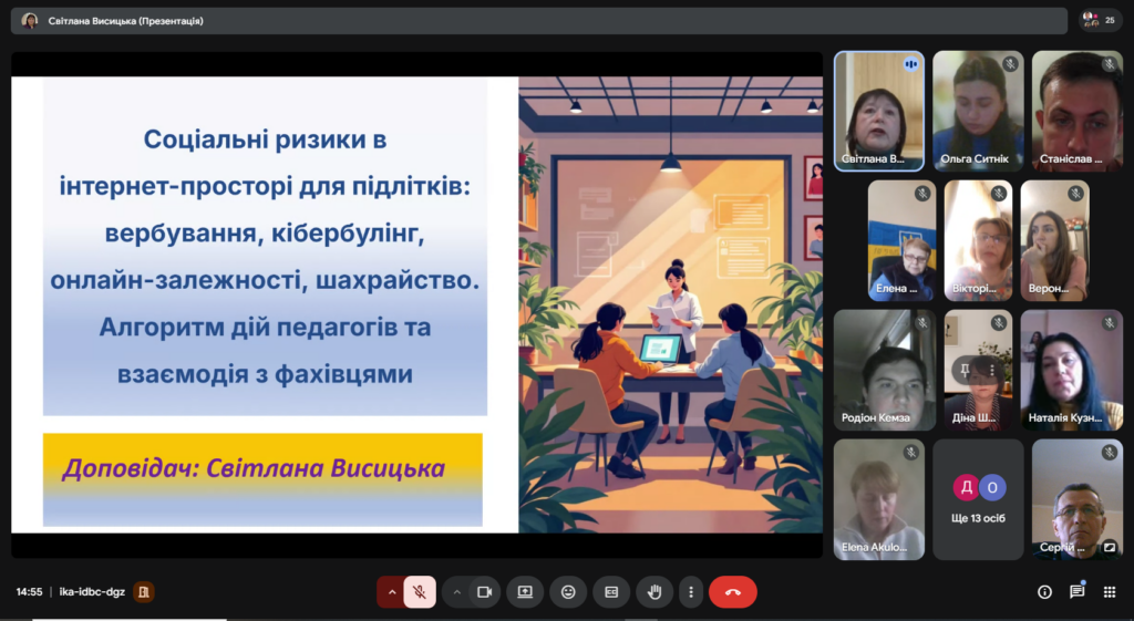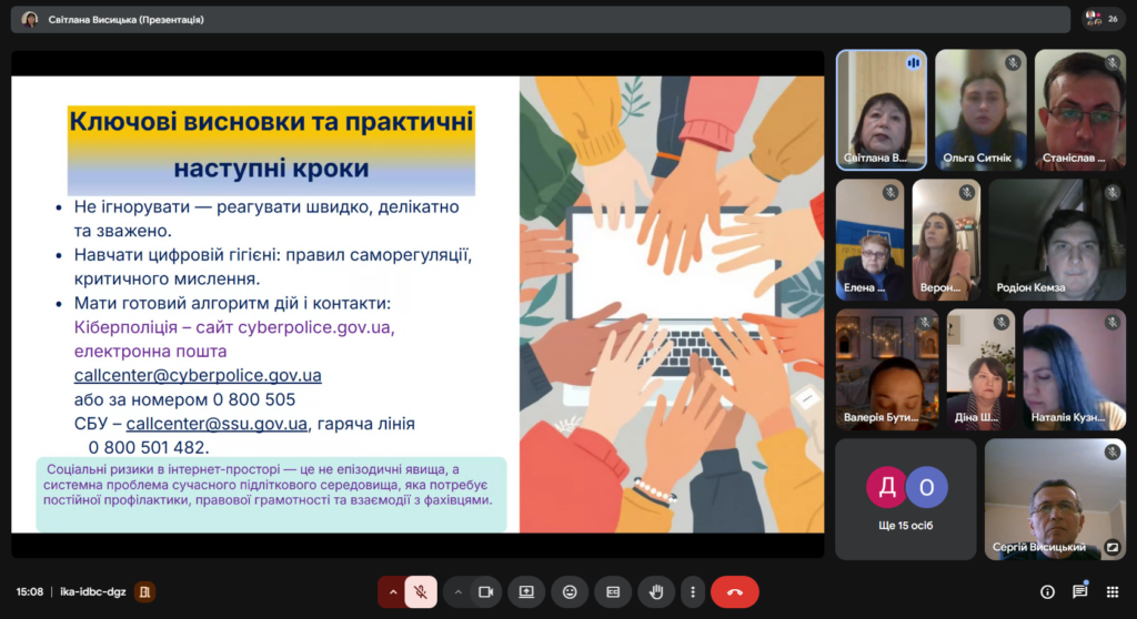 Голова методичного об’єднання Світлана Висицька розповіла про соціальні ризики в інтернет-просторі: кібербулінг, вербування, шахрайські схеми та онлайн-залежності. Наголошено на правових аспектах відповідальності та необхідності чіткого алгоритму дій педагогів у разі виявлення цифрових ризиків. Акцент зроблено на превентивній роботі та своєчасному реагуванні на тривожні сигнали.