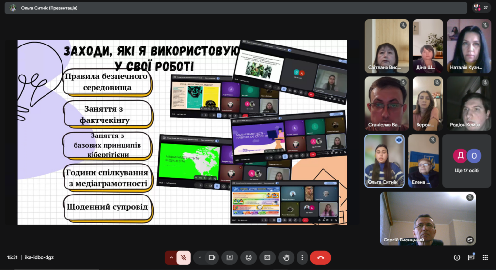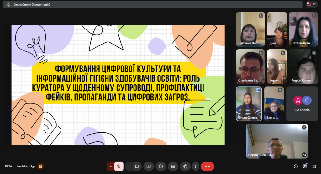 Ольга Ситнік висвітлила роль куратора у формуванні інформаційної гігієни студентів. Основну увагу приділено навчанню розпізнавати фейки й пропагандистські наративи, перевіряти джерела інформації та відповідально поширювати контент. Спікерка зазначила, що цифрова культура — це не разовий захід, а щоденний супровід, який формує безпечну модель поведінки в мережі.