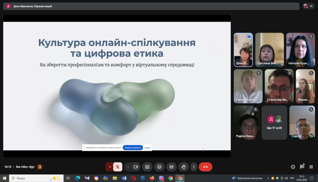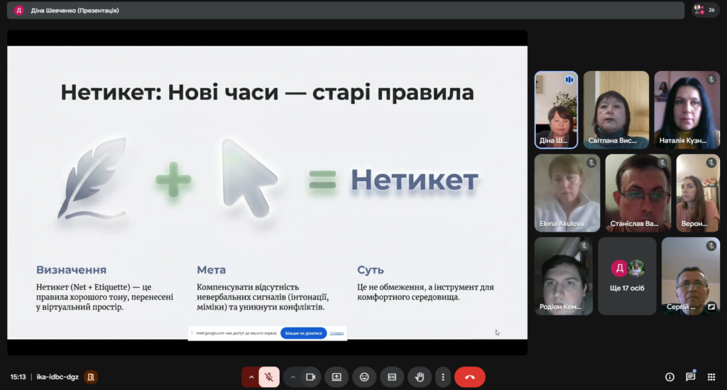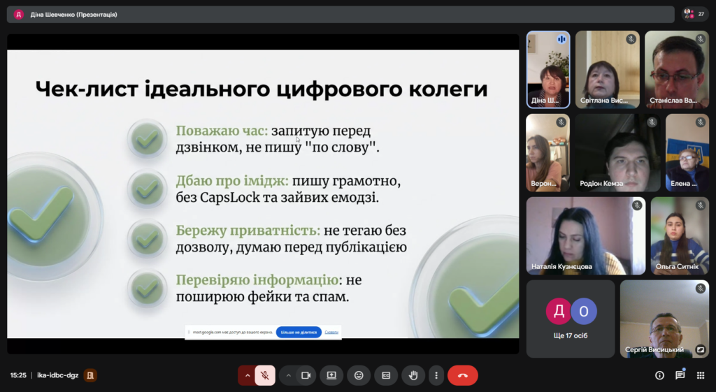 Діна Шевченко у своєму виступі зосередила увагу на понятті нетикету як основи комфортного й конструктивного спілкування. Було підкреслено важливість ввічливості, поваги до особистих меж (узгодження дзвінків, захист персональних даних). Ключова теза виступу: особистий приклад викладача — головний інструмент виховання цифрової культури.