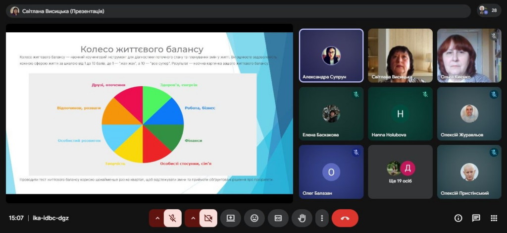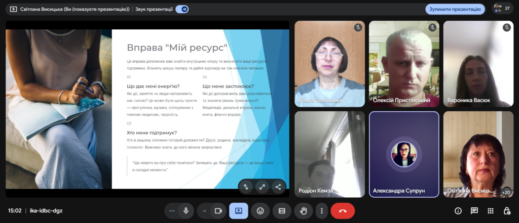 У практичній частині учасники ознайомилися з вправами«Мій ресурс», «Повна увага», техніками релаксації та емоційного відновлення, а також із методом «Колесо життєвого балансу», що допомагає оцінити рівень задоволеності різними сферами життя та визначити напрями подальшого розвитку.