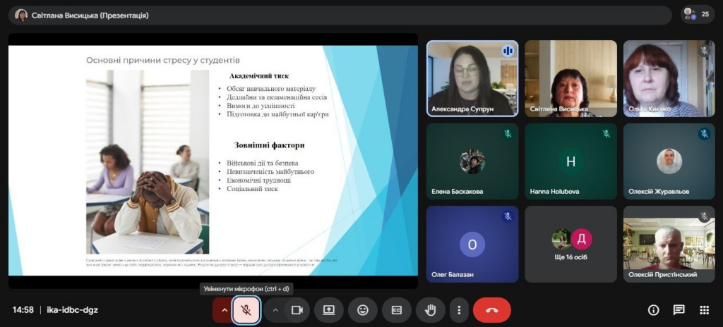 З питання психологічної підтримки студентів виступила соціальний педагог Олександра Супрун. У своїй доповіді вона акцентувала увагу на причинах стресу та тривожності серед молоді, особливостях психоемоційного стану студентів у період війни, а також на способах збереження ментального здоров’я. Значну увагу було приділено розвитку внутрішніх ресурсів особистості, формуванню стресостійкості та навичок саморегуляції.