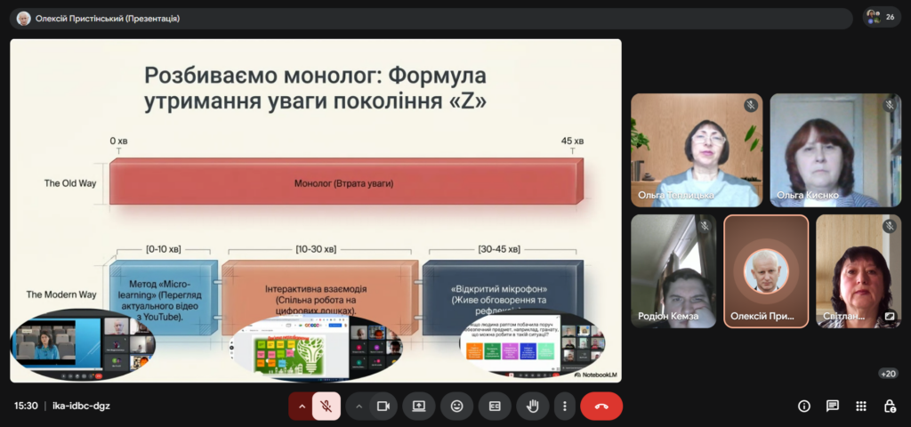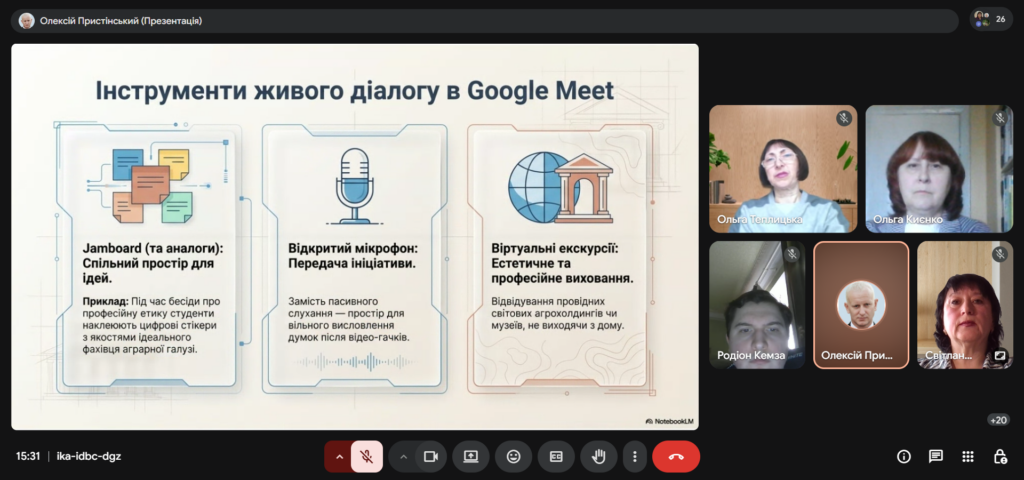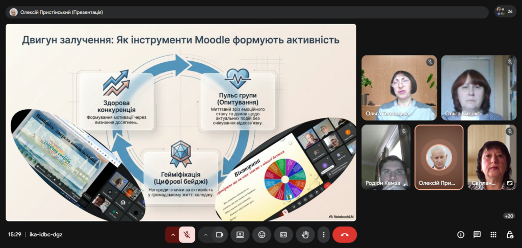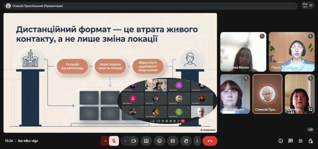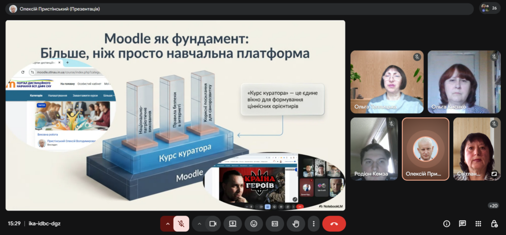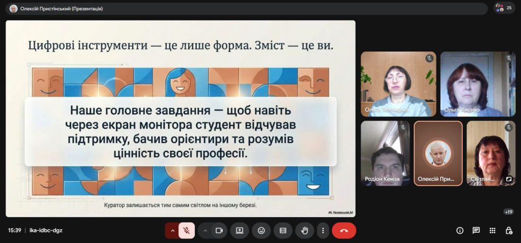 Важливою складовою зустрічі стала доповідь Олексія Пристінського, присвячена використанню сучасних цифрових інструментів у роботі куратора. Спікер презентував можливості онлайн-платформ та інтерактивних сервісів, які дозволяють проводити швидкий моніторинг емоційного стану групи, організовувати ефективний зворотний зв’язок, створювати інтерактивні вправи для психологічного розвантаження студентів у дистанційному форматі.
