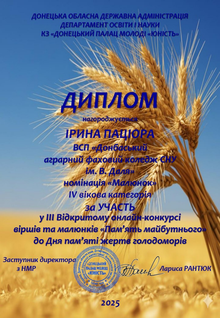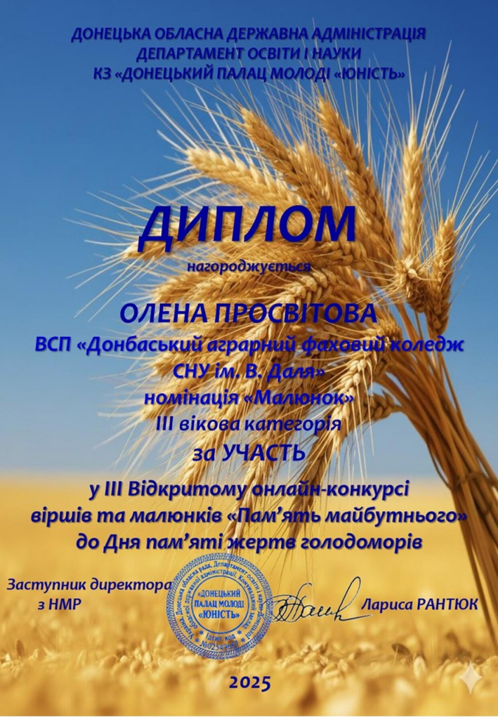 Здобувачі освіти нашого коледжу долучилися до ІІІ відкритого онлайн-конкурсу віршів та малюнків «Пам’ять майбутнього» до Дня пам’яті жертв голодоморів, організованого Донецьким Палацом молоді «Юність».