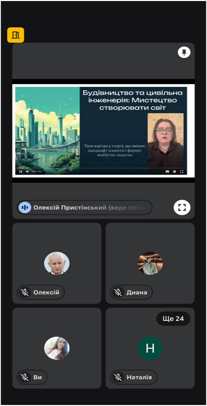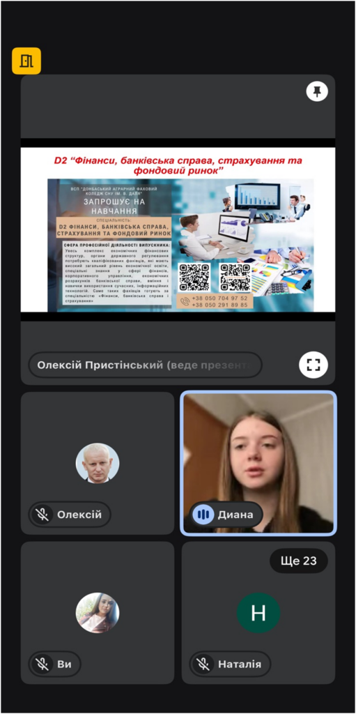 Ефективність профорієнтації значною мірою залежить від різноманітності форм і методів роботи. Сучасні технології дозволяють проводити онлайн зустрічі з випускниками шкіл. На цьому тижні було проведено два заходи з профорієнтації «Ярмарок професій ONLIN», які відбулися 7 та 10 квітня. До нас завітали: Іллінівський заклад освіти, Новодмитрівський заклад освіти, Зорянський заклад освіти Краматорського району, Костянтинівський ЗЗСО № 15 та Костянтинівський ліцей.