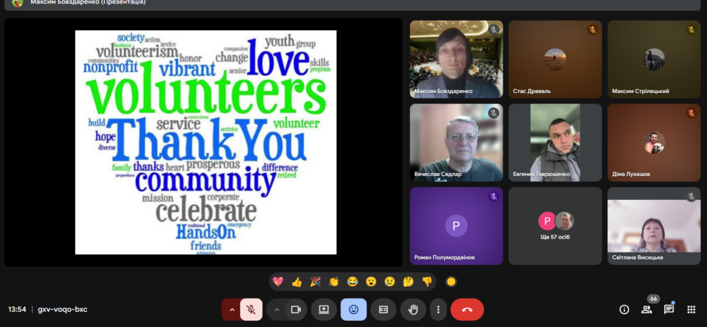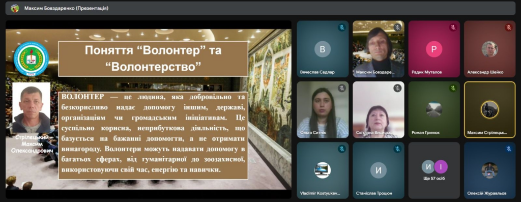 Студенти групи 2М1125 Седлар В.В. та Стрілецький М.О. представили змістовні доповіді про історію запровадження Міжнародного дня волонтера та ключові напрями діяльності волонтерських організацій. Їх виступи супроводжувалися яскравими презентаціями, а також відеоматеріалами про розвиток світового та українського волонтерського руху.