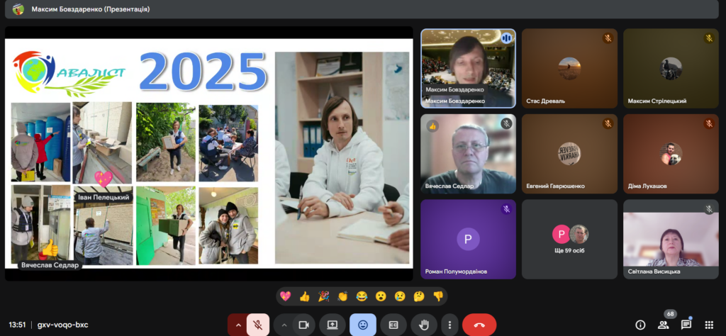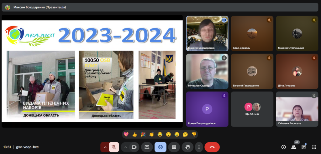 Особливу зацікавленість викликала практична частина зустрічі, присвячена обговоренню реальних волонтерських кейсів, викликів, труднощів і шляхів їх подолання. «Вільний мікрофон» відкрив Бовздаренко М.Р., який розповів про свою громадську діяльність, волонтерський досвід, активну участь у суспільному житті міста та регіону, а також про співпрацю з міськими, державними та міжнародними організаціями: Молодіжною радою міста Слов’янська, Донецькою обласною дитячо-юнацькою спортивною школою, комунальним закладом «Спорт для всіх» та громадською організацією «Аваліст». Він представив відеоматеріал про діяльність ГО «Аваліст» і детально розповів про свою участь у проєктах, спрямованих на надання гуманітарної допомоги жителям Донецької, Дніпропетровської та Харківської областей: видачу продуктових наборів і ваучерів, багатоцільову грошову допомогу, доставлення питної води, забезпечення громад будівельними матеріалами для відновлення пошкодженого майна, надання гігієнічних та непродовольчих наборів, а також виконання малогабаритних ремонтних робіт житла, пошкодженого внаслідок обстрілів.